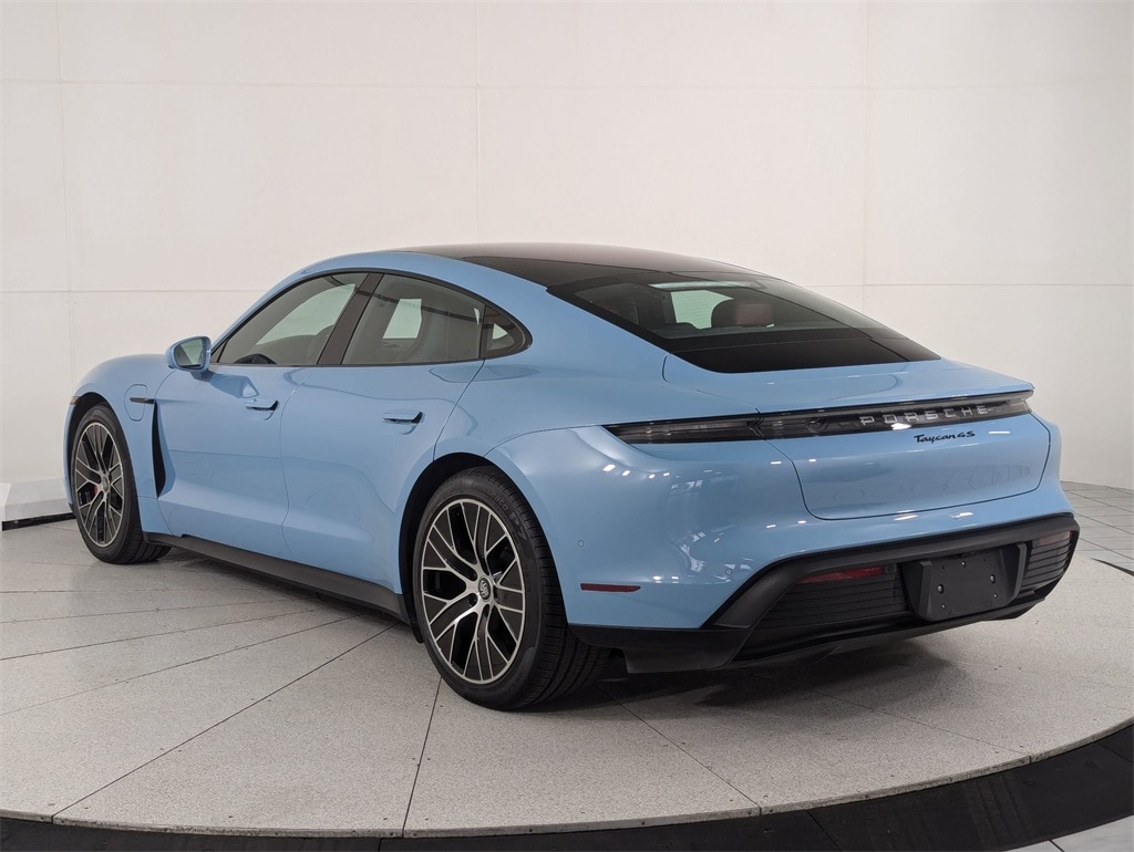 The Tech Package adds advanced driver assistance including Porsche InnoDrive with Adaptive Cruise Control and Active Lane Keep, while Surround View enhances everyday usability. Stylish touches such as 20" Taycan Turbo Aero Wheels, High Gloss Black window trim, painted exterior mirrors, puddle light projectors, and Porsche Crests on the headrests complete the look.